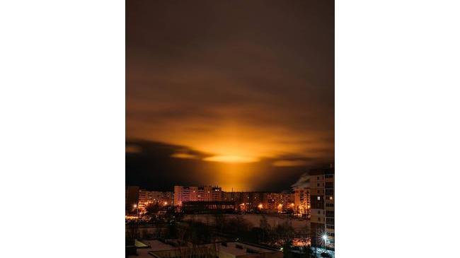 это, кстати, отражение освещения Чуриловских теплиц, которое видно далеко до подлёта на самолёте к Челябинску. У нас там рядом садовый участок, можно до ночи работать на земле без дополнительного освещения (из собственного опыта)