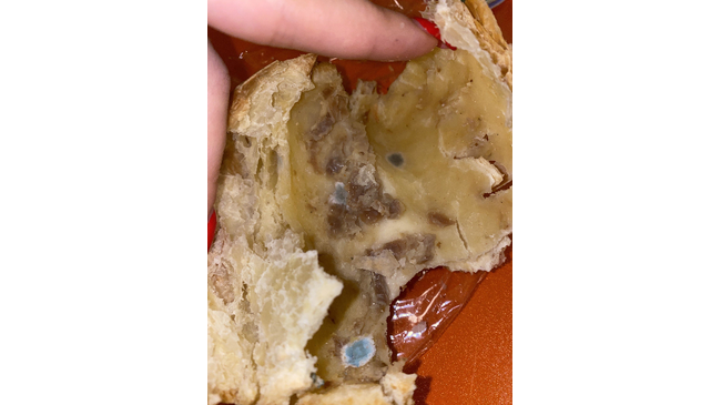 Купила слойку с грибами и картофелем, откусив уже дома почувствовала резкий вкус плесени, разломив увидела вот этот кошмар (фото прилагаю) запах просто тухлой картошки и грибов! Объясните пожалуйста как может быть такая плесень в «свежей» выпечке, она как минимум три дня лежала в тепле! Разберитесь пожалуйста в данной ситуации и начните контролировать качество продукции, которая попадает на прилавок!