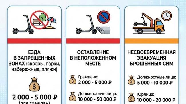 Так, за езду на самокате по скверам, паркам, набережным и пляжам штраф составит от 2 до 5 тысяч рублей. Более подробно – на картинке. Новые правила вступят в силу 1 сентября 2026 года.